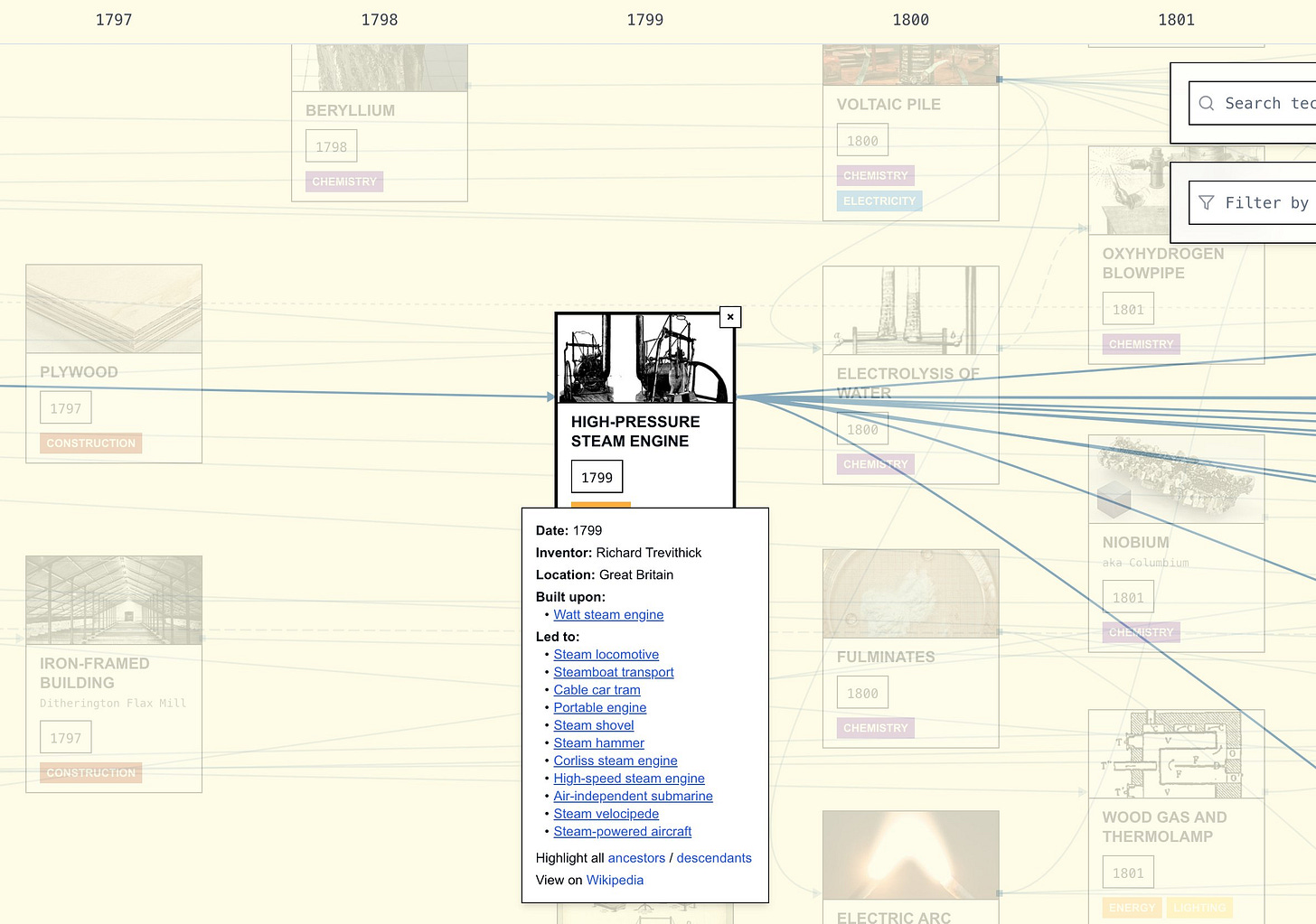 Étienne Fortier-Dubois has created a historial tech tree - something that nerds and fans of the video game Civilization series (like me) have been dreaming about in the back of our minds for years. He writes about it in issue 10 of Asterisk Magazine. The entries are more complicated than I imagined - there are 1,780 technologies (compared to 77 in the in the full game of Civ VI with all DLCs, a 23x difference, excluding civics.) It is super fine-grained!